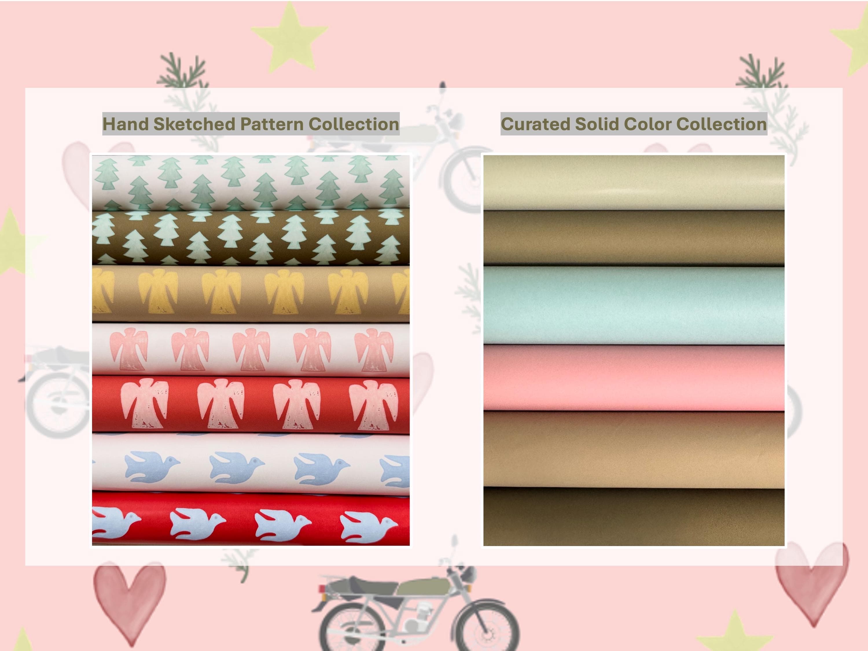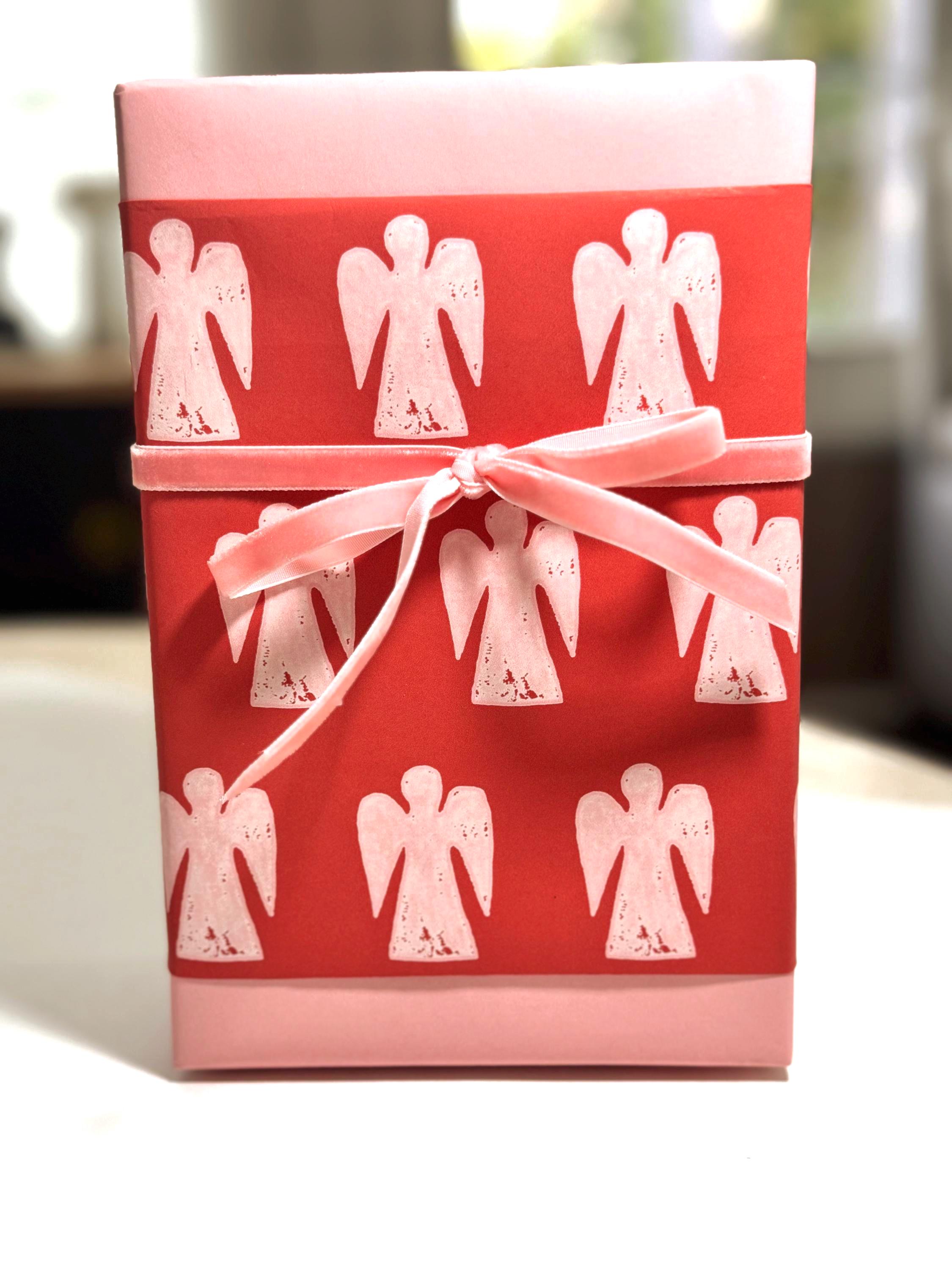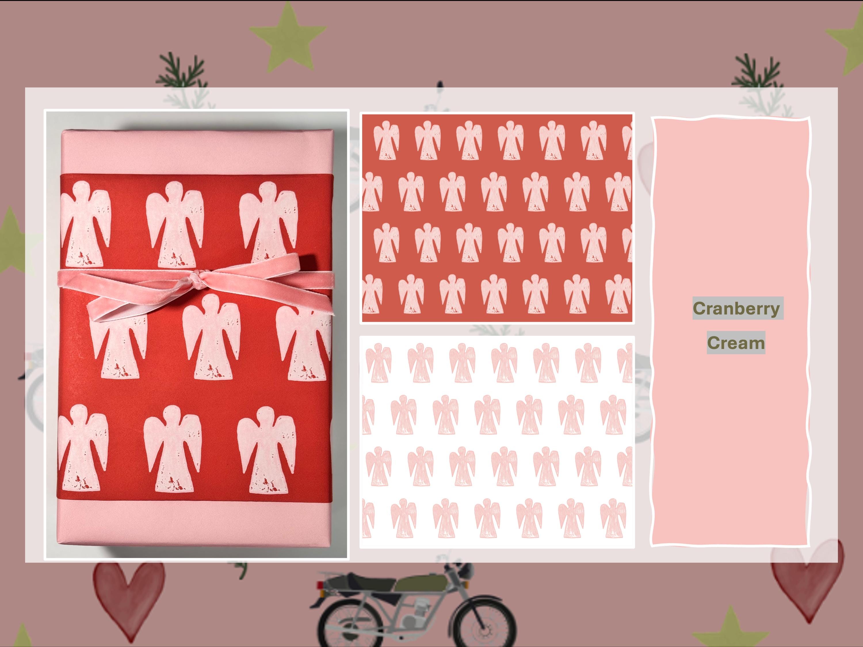 Make your gift-giving special and unique with our hand-sketched patterns and curated solid gift wrap. This fun Angel pattern in Cranberry with a Distinction Red background can be paired with a solid, or used as a stand-alone paper with a nice, textured ribbon. All purchases come with personalized support and color consultation upon request. Our designs are inspired by everyday objects, hand-drawn, digitalized and worked into a simple, yet elegant pattern.