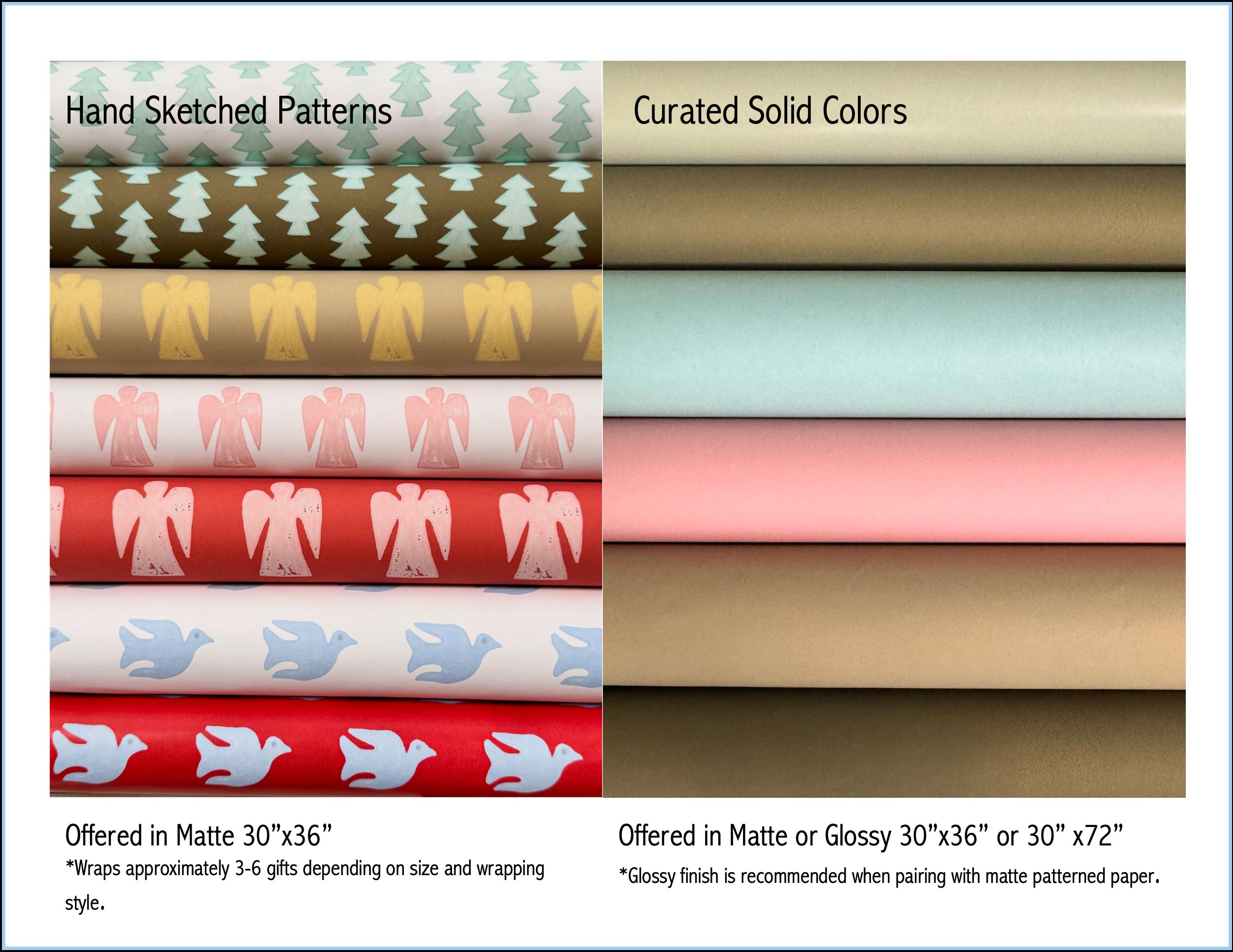 - Solid colors from a curated solid and patterned collection. - Available in Matte or Glossy, two sizes: 30" x 36" or 30" x 72". Glossy is recommended when pairing with one of our Matte Patterned Papers